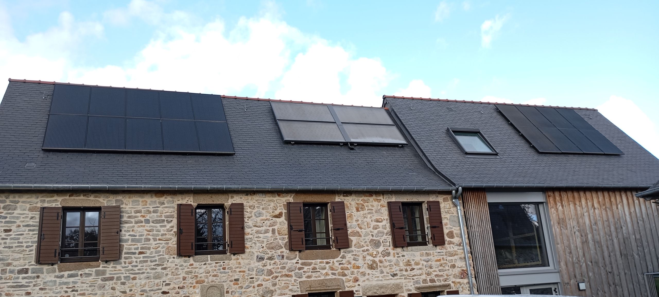 - Des panneaux solaires chauffent l’eau sanitaire et des panneaux photovoltaiques produisent de l’électricité en autoconsommation.